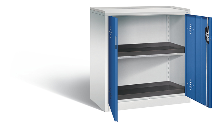 Korpus aus stabiler Stahlkonstruktion mit hochwertiger Einbrennbeschichtung für hohe UV-Beständigkeit, oben mit 3-seitiger Aufkantung als praktische Abrollsicherung, mit Kunststoffgleitern als praktischer Schrank- und Fußbodenschutz, hohe Flexibilität der Inneneinrichtung durch Höhenverstellbarkeit im 15 mm Raster, Türen verstärkt für hohe Stabilität, mit Belüftungslochbild oben und unten, Türaufhängung in Drehbolzen mit Öffnungswinkel ca. 110 Grad, zueinanderschlagend für gemeinsamen Verschluss
