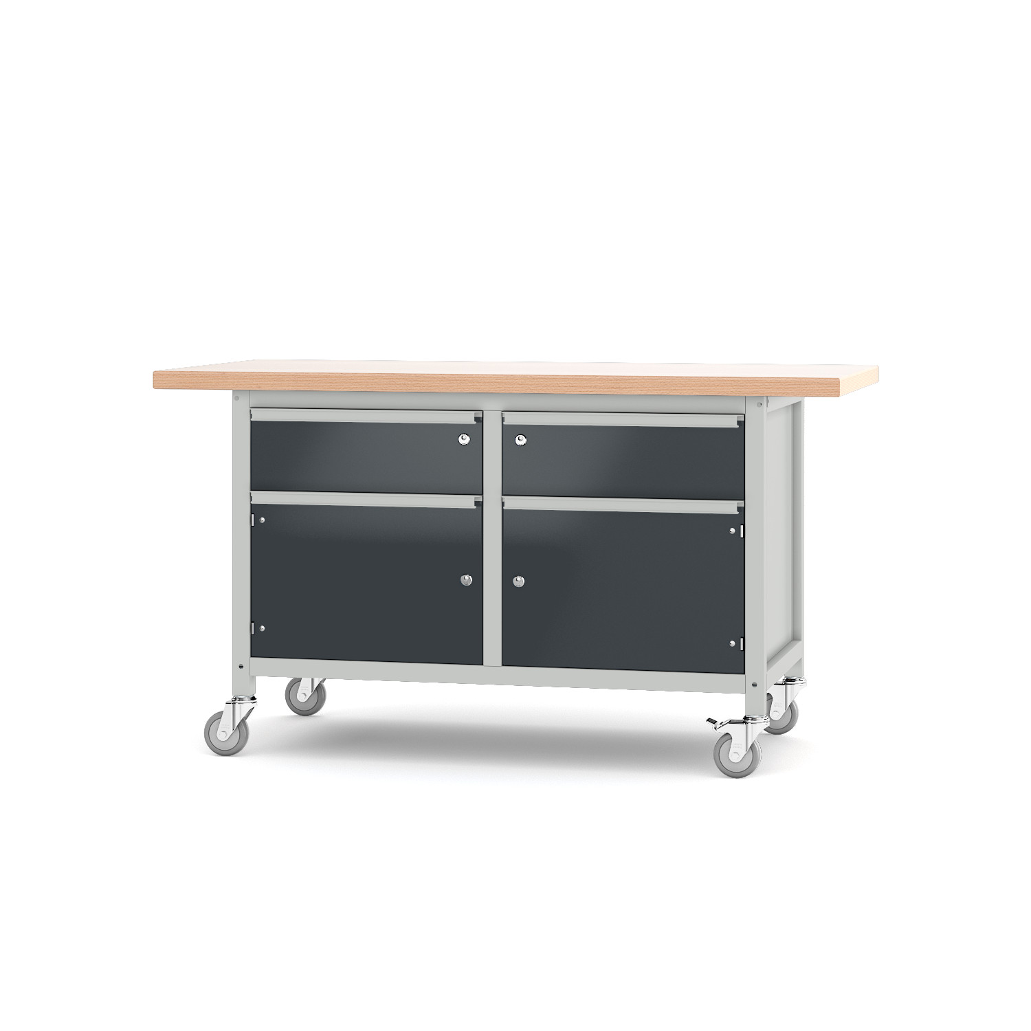 Bei der Bestellung passend zu Werkbänken, werden die Werkbänke direkt Höhengekürzt, damit eine Höhe von 855 mm erhalten bleibt und die Werkbänke mit anderen Bänken/Schränken ohne Rollen auf einer Höhe sind.